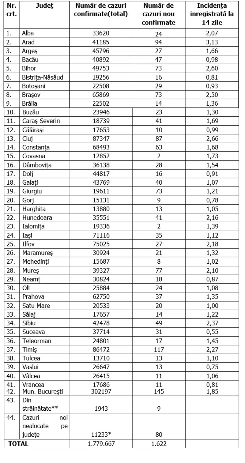 În ultimele 24 de ore au fost înregistrate 1.622 de cazuri noi de persoane infectate cu SARS – CoV – 2 (COVID – 19), dintre care 33 sunt ale unor pacienți reinfectați, testați pozitiv la o perioadă mai mare de 180 de zile după prima infectare.