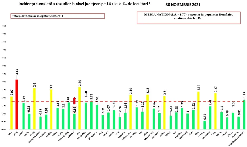 Aradul rămâne singurul județ din scenariul roșu. Călărași raportează o creștere a incidenței
