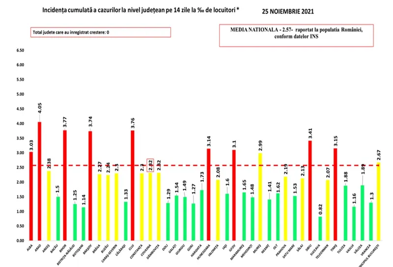 Coeficientul infectărilor cumulate la 14 zile, raportate la 1.000 de locuitori este calculat de către Direcțiile de Sănătate Publică, la nivelul Municipiului București și al județelor. Mai jos aveți graficul realizat în baza raportărilor primite de CNCCI de la Direcțiile de Sănătate Publică: