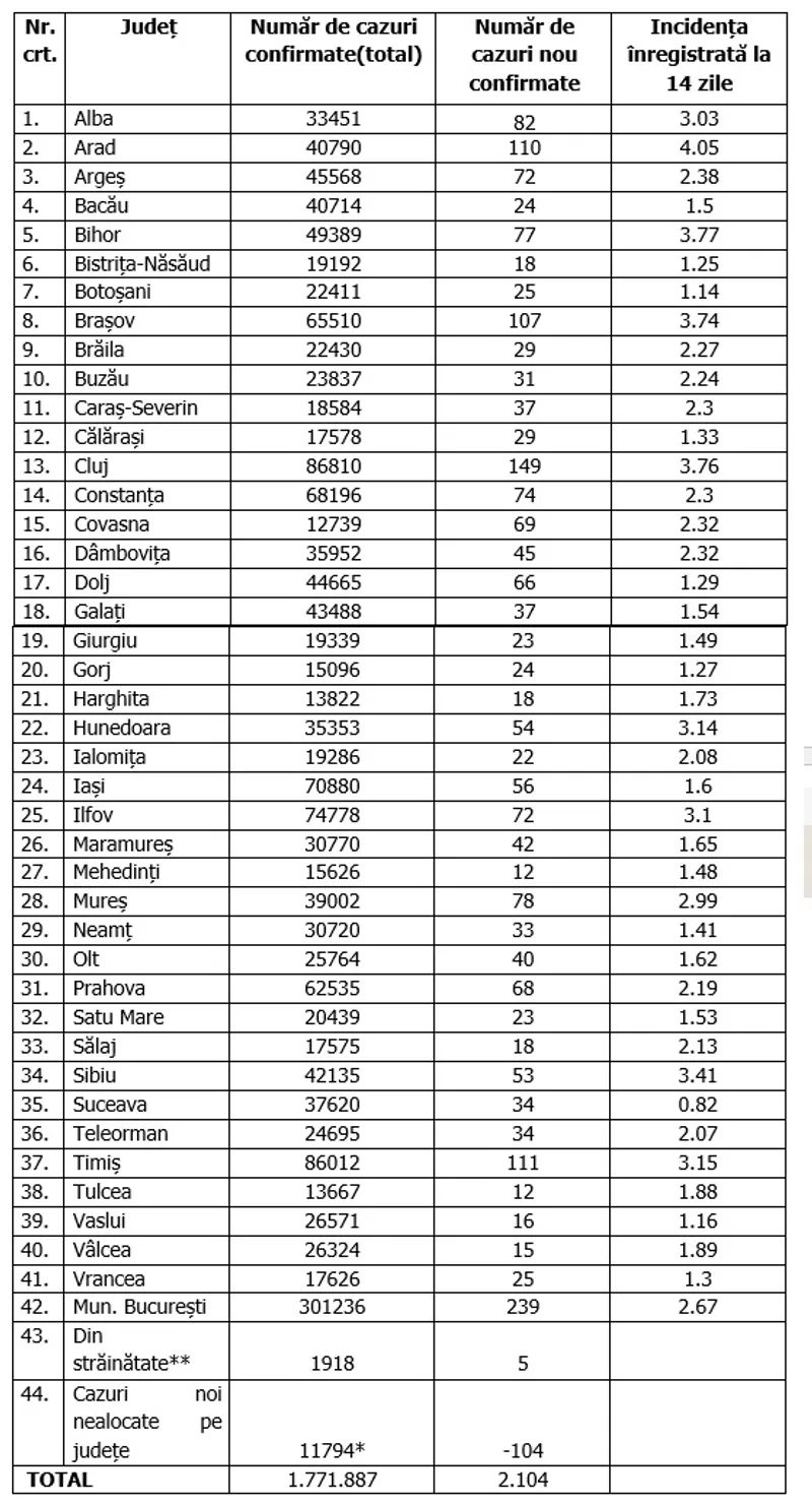 *Referitor la „cazurile noi nealocate pe județe”, facem precizarea că numărul acestora este determinat de modificările aduse platformei electronice prin care sunt raportate și centralizate rezultatele testelor pentru noul coronavirus. Astfel, conform noii metodologii, centrele de testare introduc în mod direct rezultatele testelor realizate, urmând ca de la nivelul Direcțiilor de Sănătate Publică să fie realizată ancheta epidemiologică și atribuite cazurile pozitive județului/localității de care aparțin persoanele infectate.