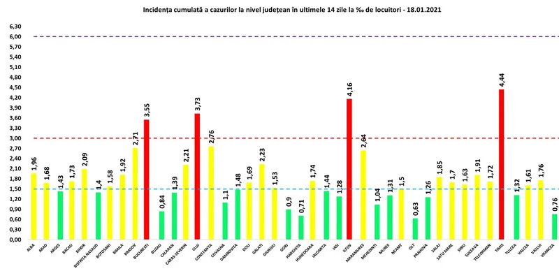 Coeficientul infectărilor cumulate la 14 zile, raportate la 1.000 de locuitori este calculat de către Direcțiile de Sănătate Publică, la nivelul Municipiului București și al județelor. Mai jos aveți graficul realizat în baza raportărilor primite de CNCCI de la Direcțiile de Sănătate Publică: