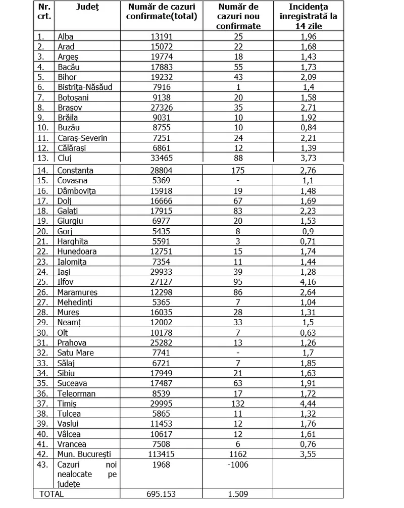 În total, în România au fost confirmate 695.153 de cazuri de infectare cu coronavirus, iar 17.271 de oameni infectați au murit.