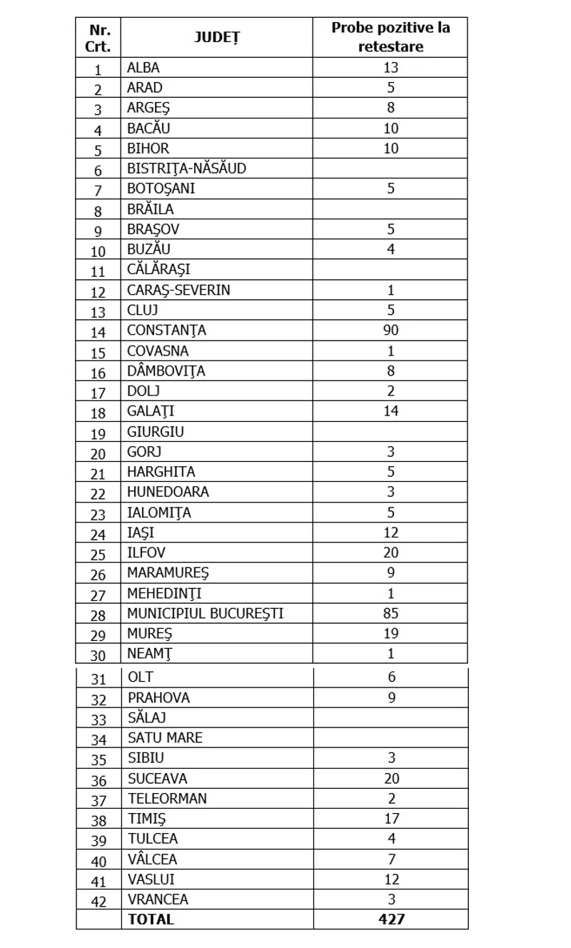 Distinct de cazurile nou confirmate, în urma retestării pacienților care erau deja pozitivi, 427 de persoane au fost reconfirmate pozitiv.