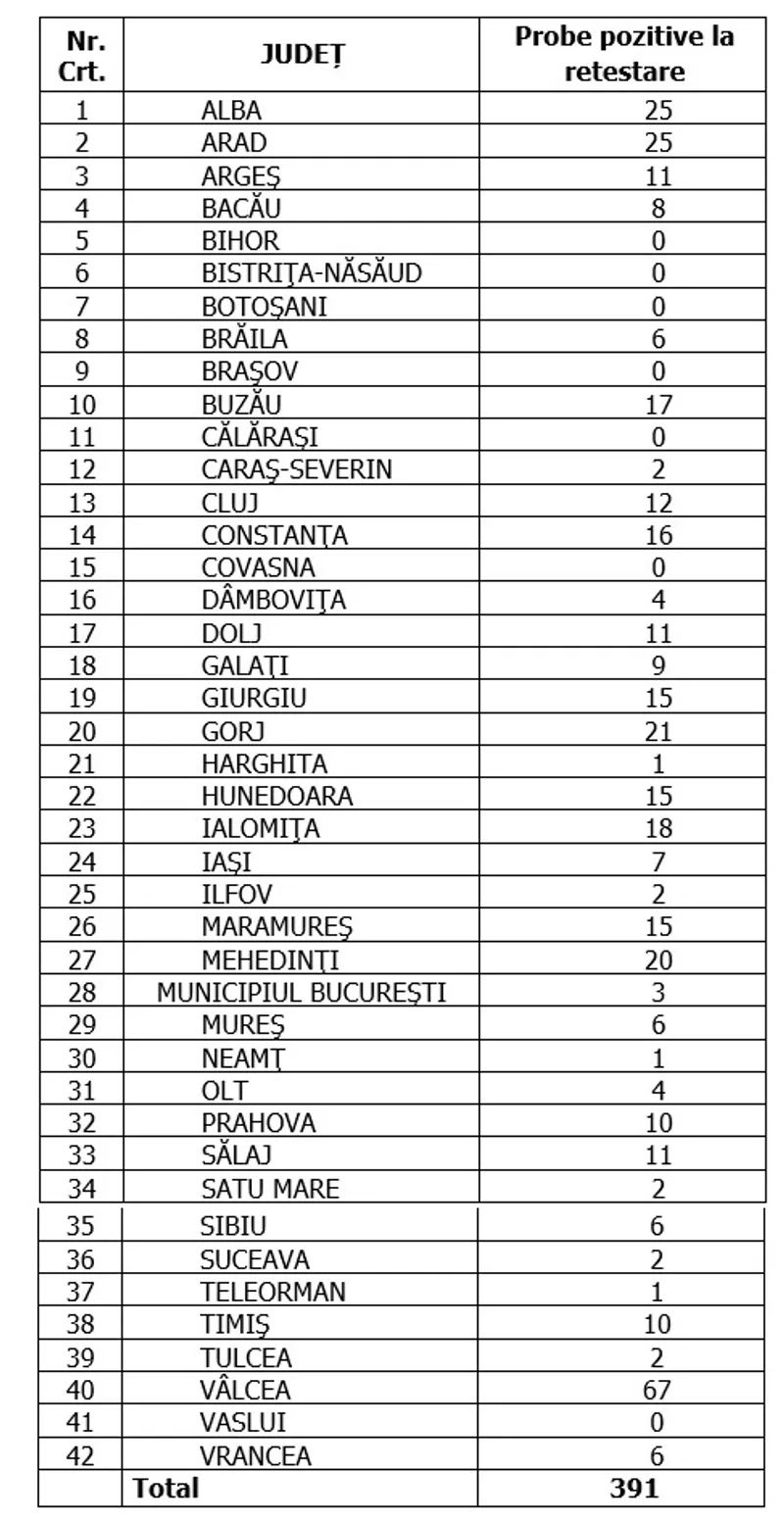 Distinct de cazurile nou confirmate, în urma retestării pacienților care erau deja pozitivi, 391 de persoane au fost reconfirmate pozitiv. Distribuția pe județe a acestor cazuri o regăsiți în tabelul de mai jos: