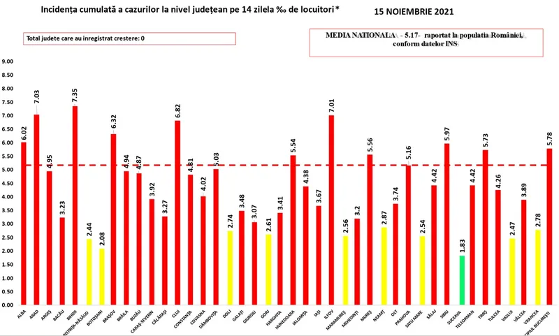 Coeficientul infectărilor cumulate la 14 zile, raportate la 1.000 de locuitori este calculat de către Direcțiile de Sănătate Publică, la nivelul Municipiului București și al județelor. Mai jos aveți graficul realizat în baza raportărilor primite de CNCCI de la Direcțiile de Sănătate Publică: