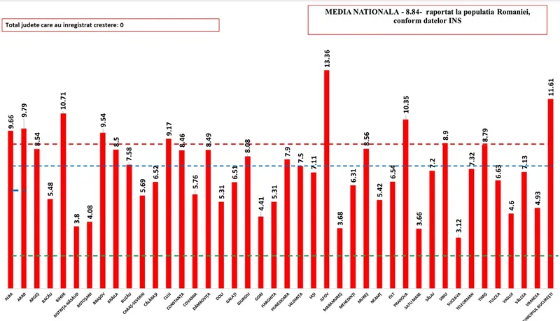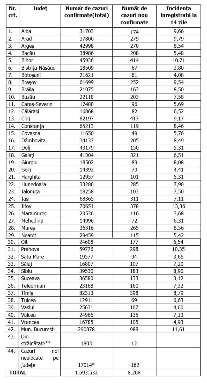 Distribuția pe județe a cazurilor per total și a celor noi o regăsiți în tabelul de mai jos: