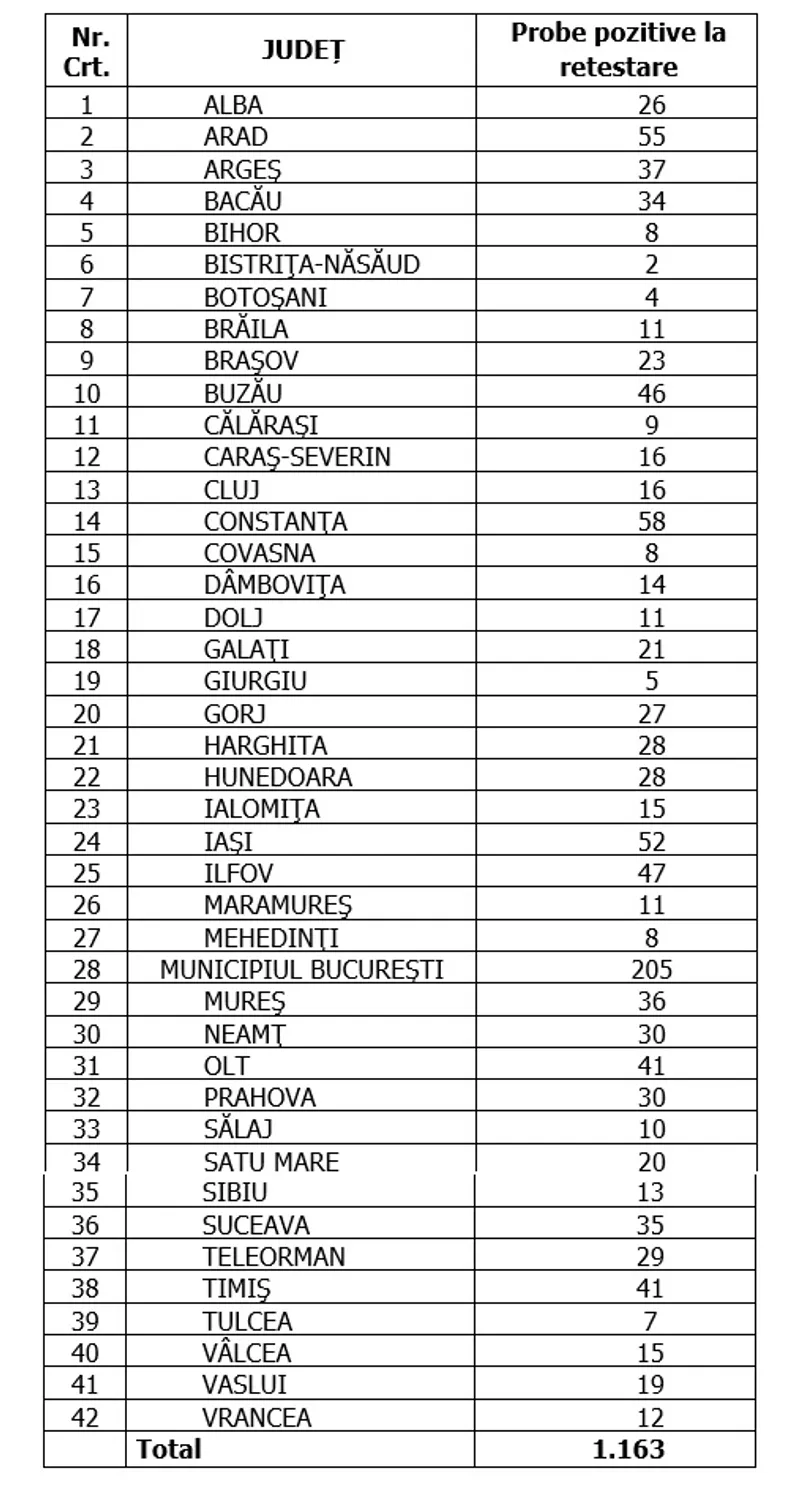 Distinct de cazurile nou confirmate, în urma retestării pacienților care erau deja pozitivi, 1.163 de persoane au fost reconfirmate pozitiv. Distribuția pe județe a acestor cazuri o regăsiți în tabelul de mai jos: