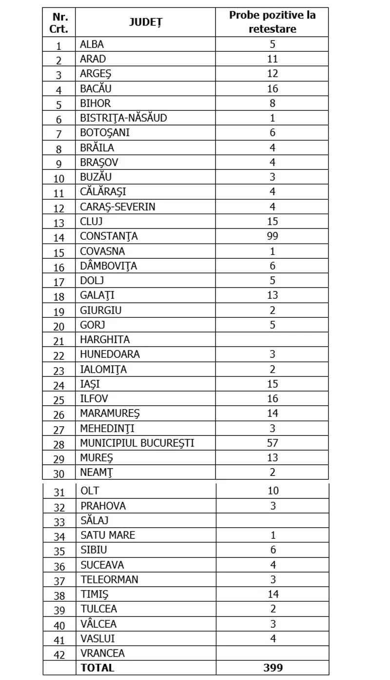 Distinct de cazurile nou confirmate, în urma retestării pacienților care erau deja pozitivi, 399 de persoane au fost reconfirmate pozitiv.