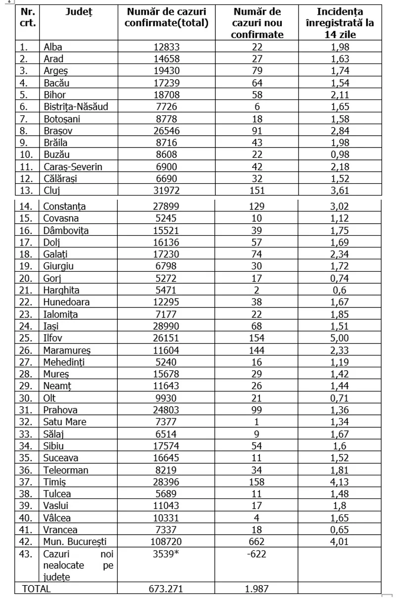 În total, de la izbucnirea pandemiei în România, au fost confirmate 673.271 de cazuri de infectare cu coronavirus, iar 16.725 de pacienți infectați au murit.