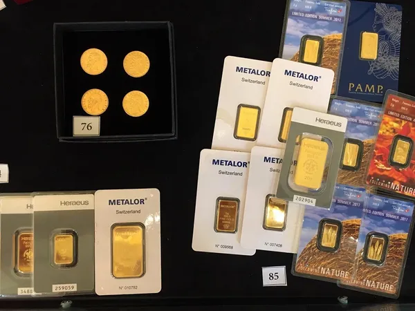 O apariție rară în licitație este și cea a lingourilor și a monedelor din aur - moneda forte în momente de criză. Patru lingouri din aur de 10 și 20 de grame sau un lot format din 11 mini-lingouri pornesc în licitație cu un preț de pornire de 2.500, respectiv 1.600 de euro. Totodată, o colecție de 32 de monede din aur, fiecare echivalând 20 de franci elvețieni emise între anii 1915-1947 are un preț de pornire de 5.000 de euro. Acesteia i se adaugă alte 50 de monede din aur cu efigia unor personalități istorice - de la țarul Nicolae II sau împăratul Franz Josef, Napoleon și până la Regele Carol al României, înregistrând prețuri de pornire între 300 și 3.200 de euro.
