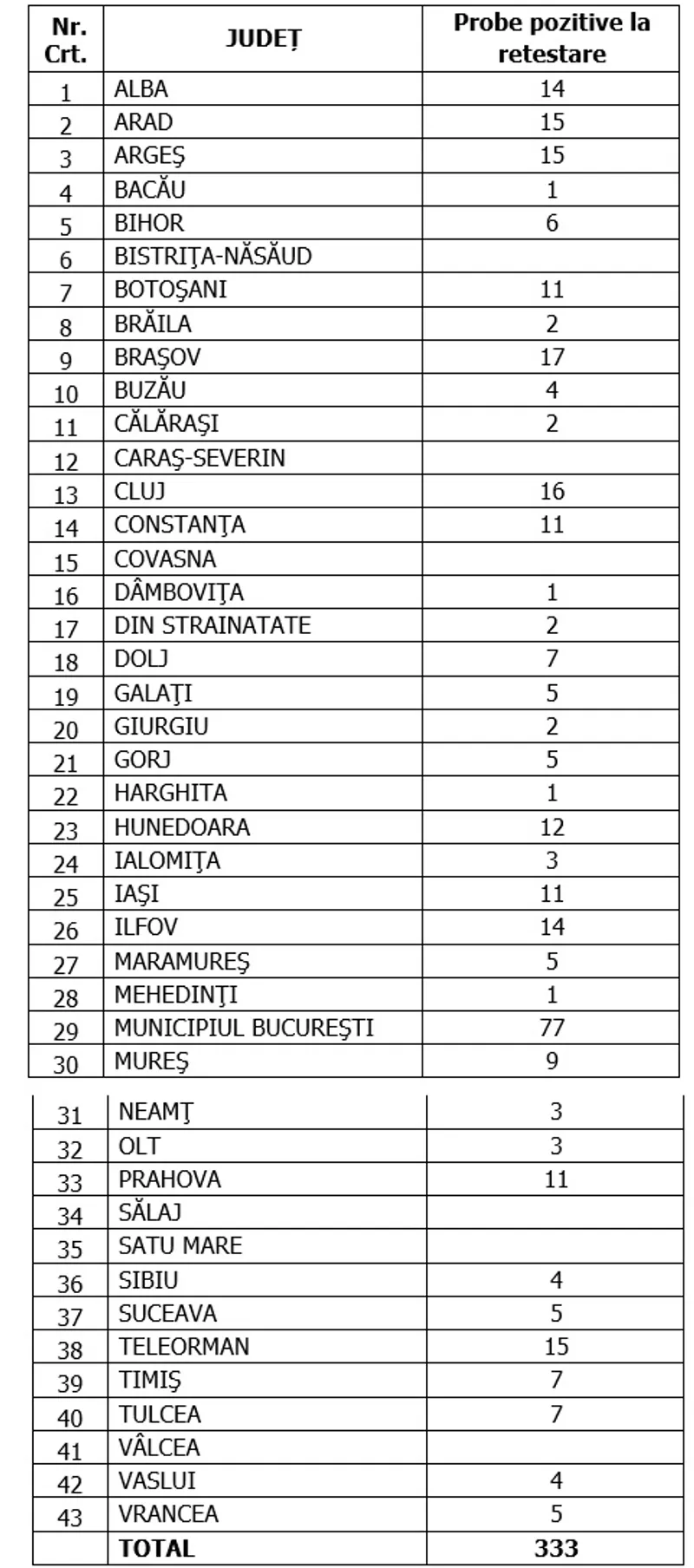 Distinct de cazurile nou confirmate, în urma retestării pacienților care erau deja pozitivi, 333 de persoane au fost reconfirmate pozitiv.
