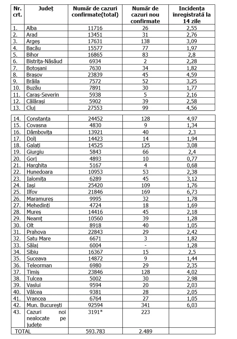 În urma testelor efectuate la nivel național, față de ultima raportare, au fost înregistrate 2.489 cazuri noi de persoane infectate cu SARS – CoV – 2, acestea fiind cazuri care nu au mai avut anterior un test pozitiv.