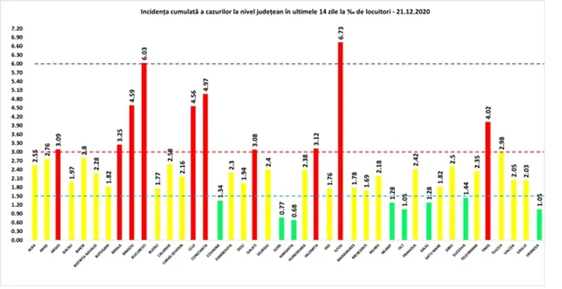 Coeficientul infectărilor cumulate la 14 zile, raportate la 1.000 de locuitori este calculat de către Direcțiile de Sănătate Publică, la nivelul Municipiului București și al județelor. Mai jos aveți graficul realizat în baza raportărilor primite de CNCCI de la Direcțiile de Sănătate Publică: