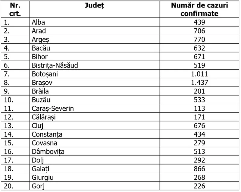 În ultimele 24 de ore, 22 de persoane infectate cu Covid-19 și-au pierdut viața. „În intervalul 28.06.2020 (10:00) – 29.06.2020 (10:00) au fost înregistrate 22 decese (12 bărbați și 10 femei), ale unor pacienți infectați cu noul coronavirus, internați în spitalele din Arad, Argeș, Bihor, Botoșani, Brașov, Constanța, Iași, București, Mureș, Prahova, Suceava și Vrancea.