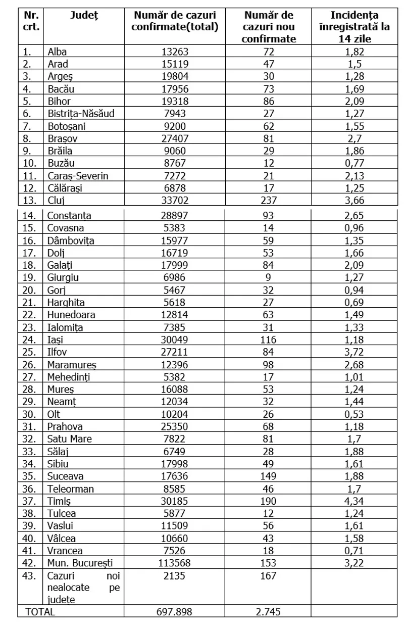 În total, în România au fost confirmate 697.898 de cazuri de infectare cu coronavirus, iar 17.369 de oameni infectați au murit.