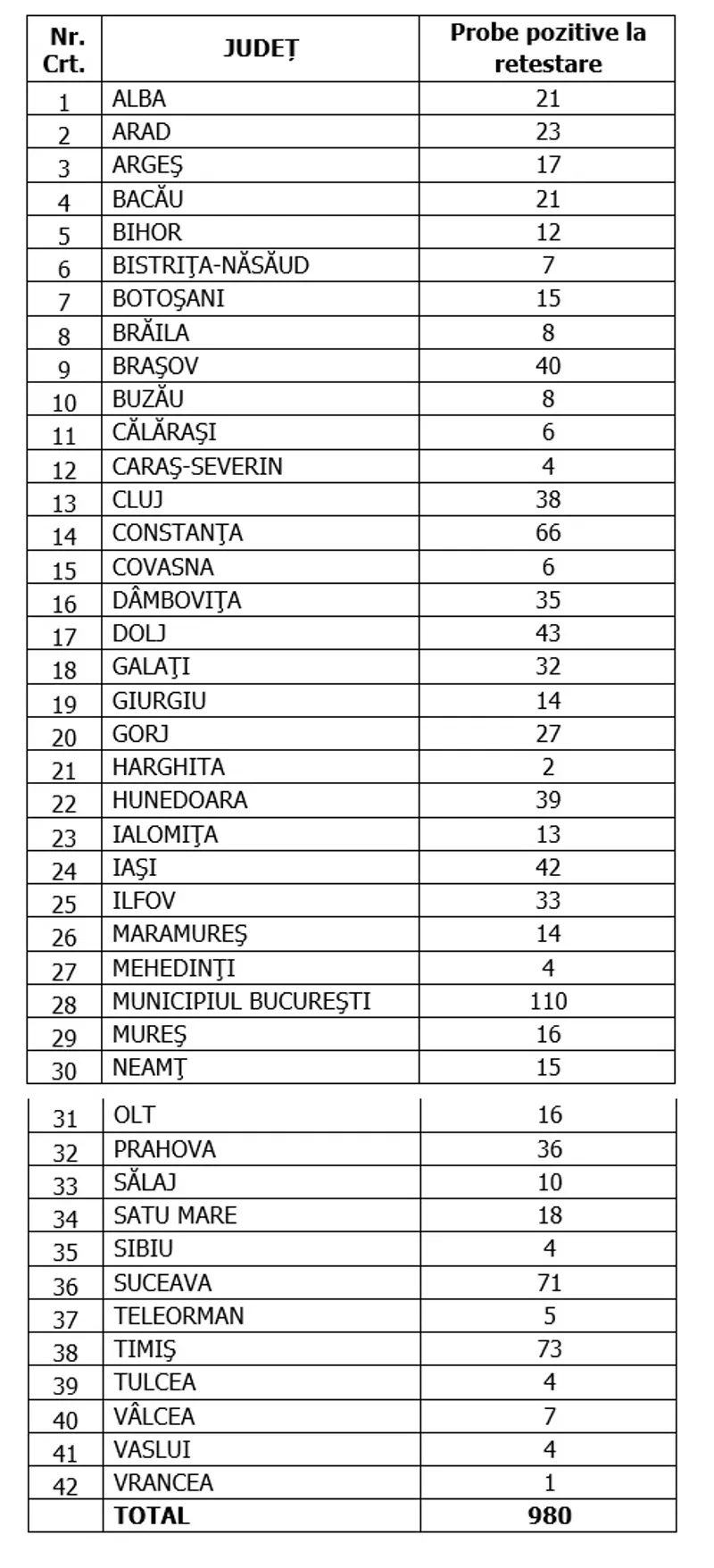 Distinct de cazurile nou confirmate, în urma retestării pacienților care erau deja pozitivi, 980 de persoane au fost reconfirmate pozitiv.