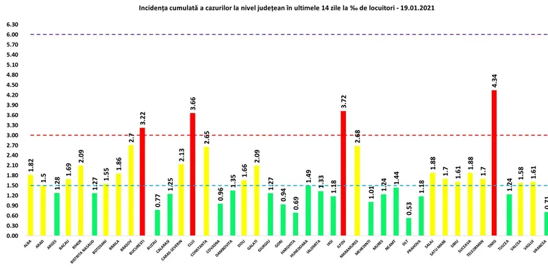 Coeficientul infectărilor cumulate la 14 zile, raportate la 1.000 de locuitori este calculat de către Direcțiile de Sănătate Publică, la nivelul Municipiului București și al județelor. Mai jos aveți graficul realizat în baza raportărilor primite de CNCCI de la Direcțiile de Sănătate Publică: