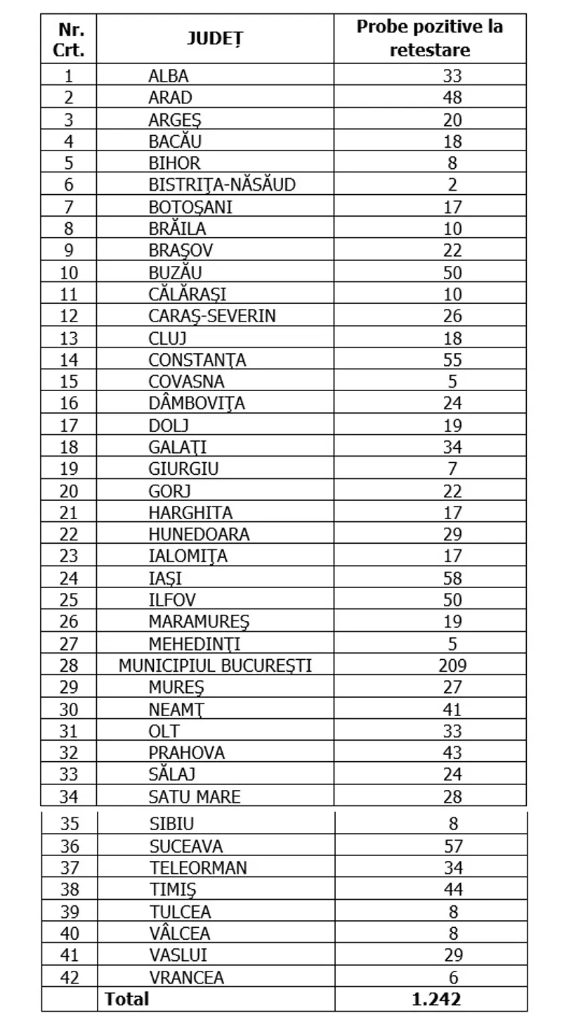 Distinct de cazurile nou confirmate, în urma retestării pacienților care erau deja pozitivi, 1.242 de persoane au fost reconfirmate pozitiv. Distribuția pe județe a acestor cazuri o regăsiți în tabelul de mai jos.
