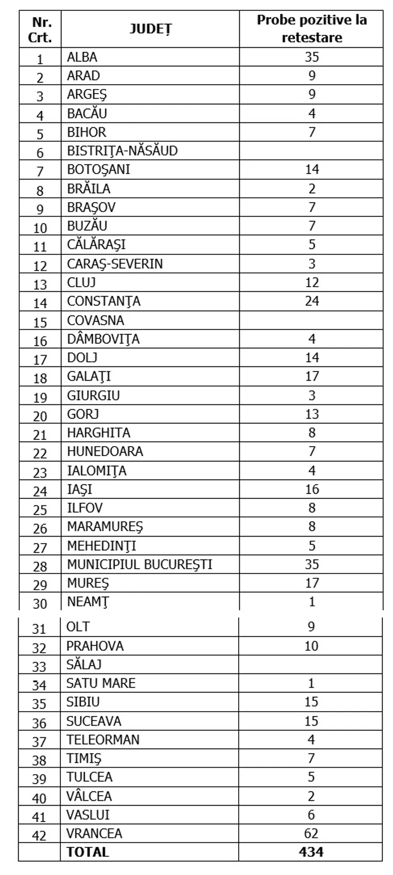 Distinct de cazurile nou confirmate, în urma retestării pacienților care erau deja pozitivi, 434 de persoane au fost reconfirmate pozitiv.