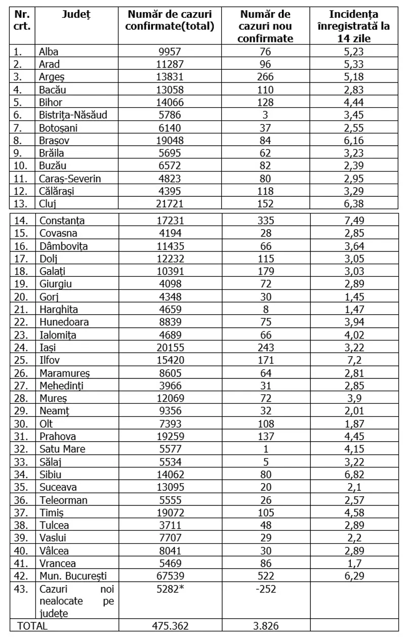 În total, în România s-au înregistrat 475.362 de cazuri de infectare cu coronavirus, iar 11.331 de oameni infectați au murit, conform datelor Grupului de Comunicare Strategică (GCS).