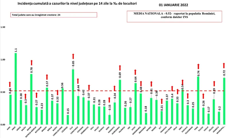 „În intervalul 31.12.2021 (10:00) – 01.01.2022 (10:00) au fost raportate de către INSP 27 de decese (11 bărbați și 16 femei), dintre care unul anterior intervalului de referință, ale unor pacienți infectați cu noul coronavirus, internați în spitalele din Alba, Argeș, Arad, Bistrița-Năsăud, Buzău, Constanța, Gorj, Harghita, Ialomița, Maramureș, Mureș, Neamț, Satu Mare și Municipiul București.