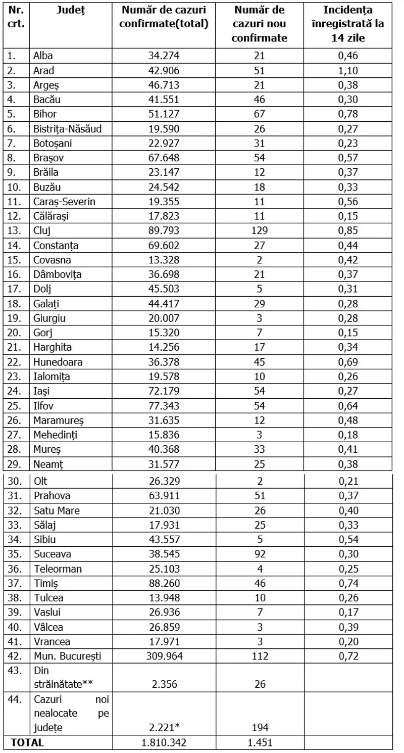 Distribuția pe județe a cazurilor per total și a celor noi o regăsiți în tabelul de mai jos:
