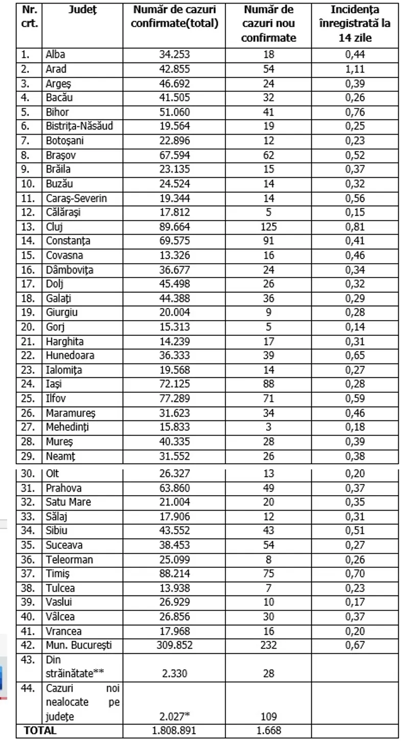 Distribuția pe județe a cazurilor per total și a celor noi o regăsiți în tabelul de mai jos: