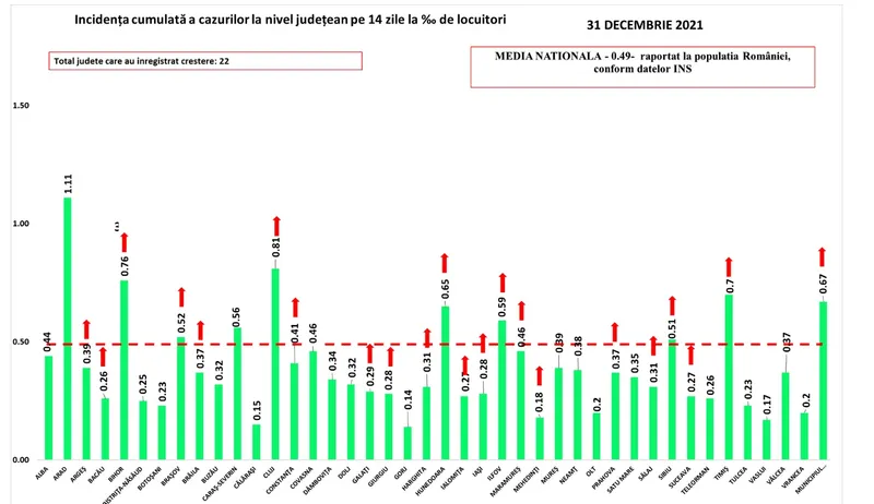 „În intervalul 30.12.2021 (10:00) – 31.12.2021 (10:00) au fost raportate de către INSP 38 de decese (16 bărbați și 22 femei), dintre care unul anterior intervalului de referință, ale unor pacienți infectați cu noul coronavirus, internați în spitalele din Argeș, Arad, Bihor, Bistrița-Năsăud, Brașov, Buzău, Caraș-Severin, Cluj, Constanța, Dâmbovița, Dolj, Galați, Harghita, Hunedoara, Mureș, Neamț, Prahova, Sălaj, Timiș și Municipiul București.