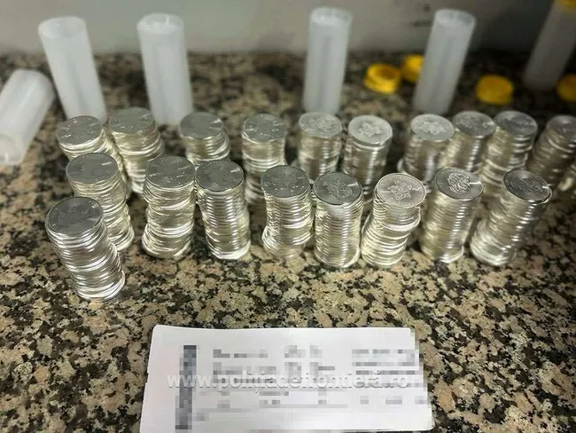 Cu ocazia controlului efectuat asupra bagajelor de mână ale celor doi pasageri, au fost descoperite, nedeclarate, 500 monede, confecționate dintr-un metal de culoare albă.