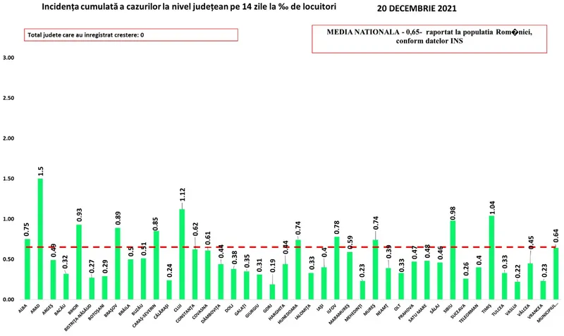 Coeficientul infectărilor cumulate la 14 zile, raportate la 1.000 de locuitori este calculat de către Direcțiile de Sănătate Publică, la nivelul Municipiului București și al județelor. Mai jos aveți graficul realizat în baza raportărilor primite de CNCCI de la Direcțiile de Sănătate Publică: