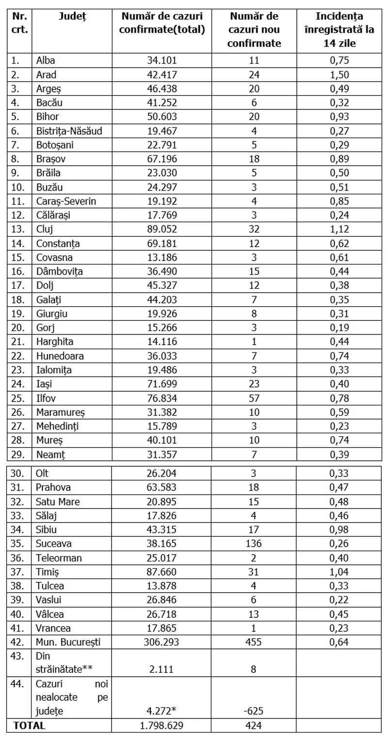 Distribuția pe județe a cazurilor per total și a celor noi o regăsiți în tabelul de mai jos: