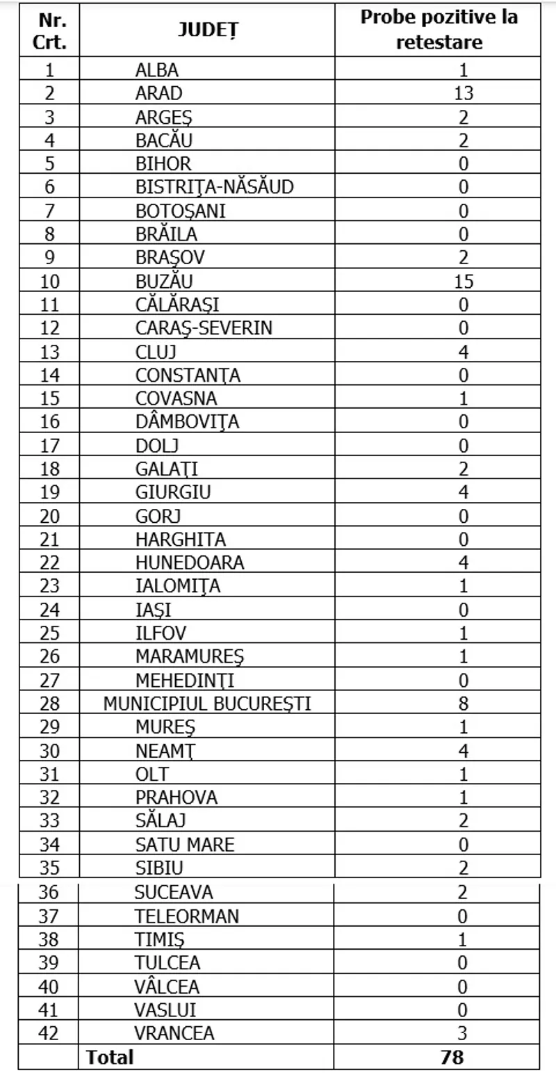 Distinct de cazurile nou confirmate, în urma retestării pacienților care erau deja pozitivi, 78 de persoane au fost reconfirmate pozitiv. Distribuția pe județe a acestor cazuri o regăsiți în tabelul de mai jos: