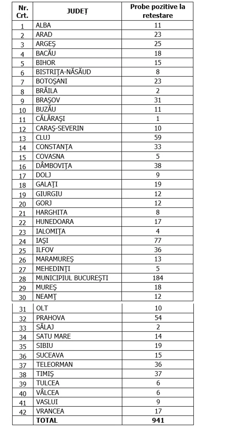 Distinct de cazurile nou confirmate, în urma retestării pacienților care erau deja pozitivi, 941 de persoane au fost reconfirmate pozitiv.