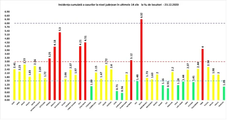 Coeficientul infectărilor cumulate la 14 zile, raportate la 1.000 de locuitori este calculat de către Direcțiile de Sănătate Publică, la nivelul Municipiului București și al județelor. Mai jos aveți graficul realizat în baza raportărilor primite de CNCCI de la Direcțiile de Sănătate Publică: