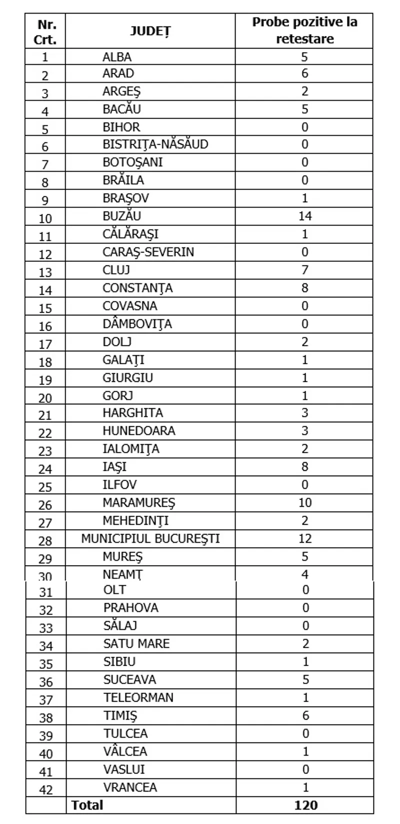 Distinct de cazurile nou confirmate, în urma retestării pacienților care erau deja pozitivi, 120 persoane au fost reconfirmate pozitiv. Distribuția pe județe a acestor cazuri o regăsiți în tabelul de mai jos: