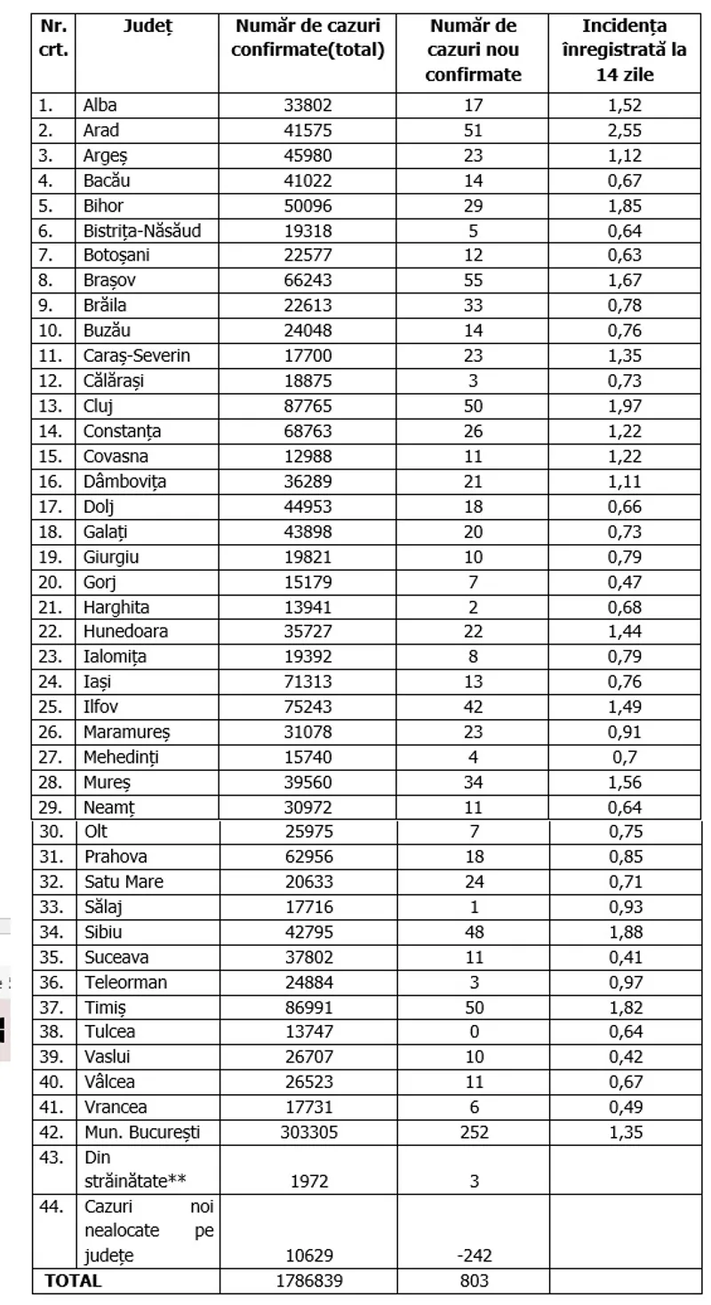 Distribuția pe județe a cazurilor per total și a celor noi o regăsiți în tabelul de mai jos: