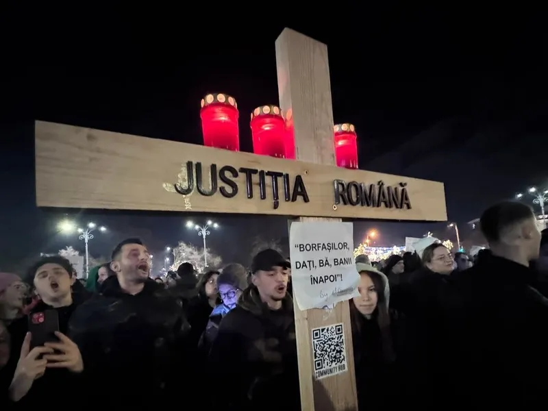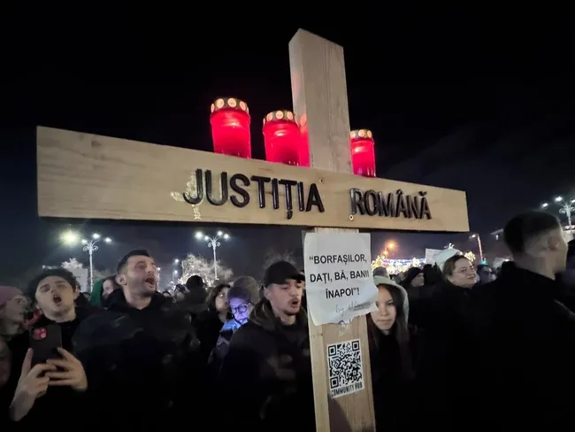 Participanții la protest au adus și o cruce de lemn inscripționată cu textul 'Justiția română', în jurul căreia au așezat candele.