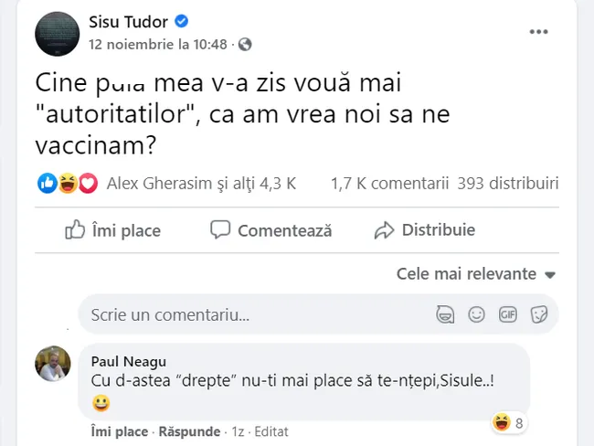 Tudor Sișu a posta un mesaj anti-vaccinare pe Facebook, iar reacțiile nu au întârziat să apară. Mulți internauți i-au reamintit de trecutul său de consumator și traficant de droguri.