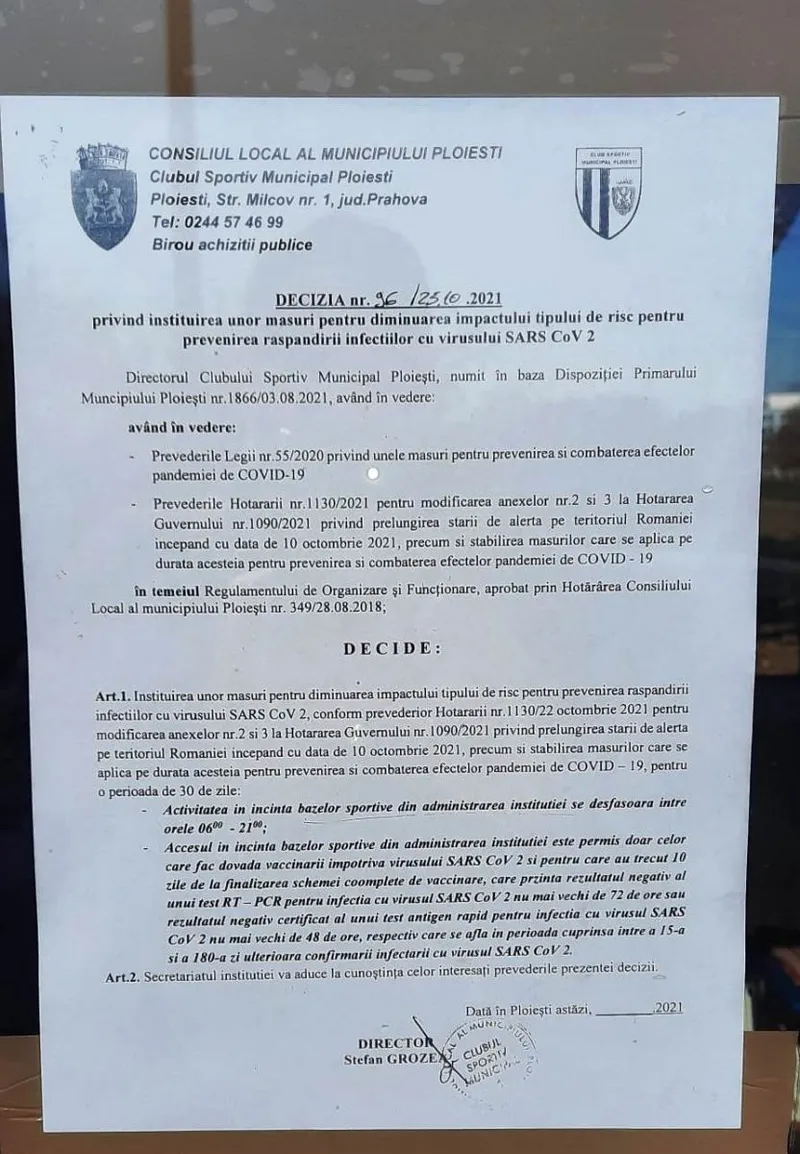 La intrarea în unitate este un afiş potrivit căruia accesul în incinta bazelor sportive din administrarea CSM este permis doar celor care au schema completă de vaccinare, celor trecuţi prin boală şi celor care prezintă rezultatul unui test negativ RT-PCR nu mai vechi de 72 de ore sau rezultatul negativ al unui test antigen rapid nu mai vechi de 48 de ore.