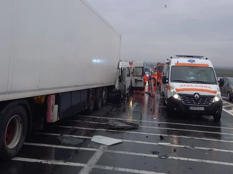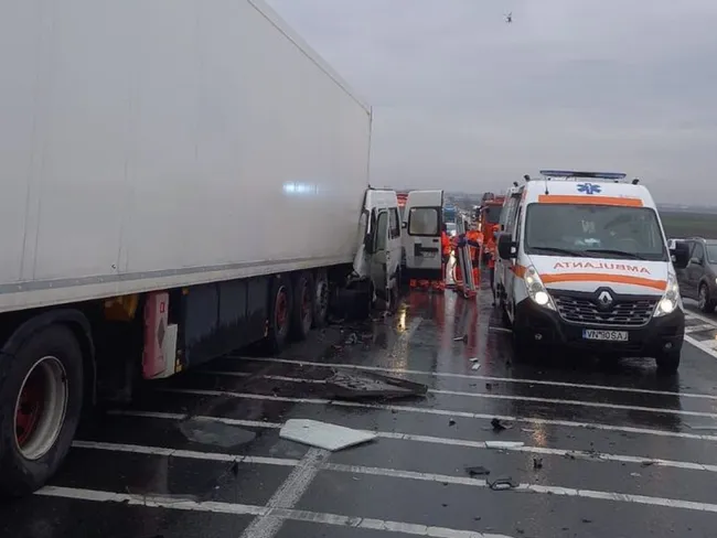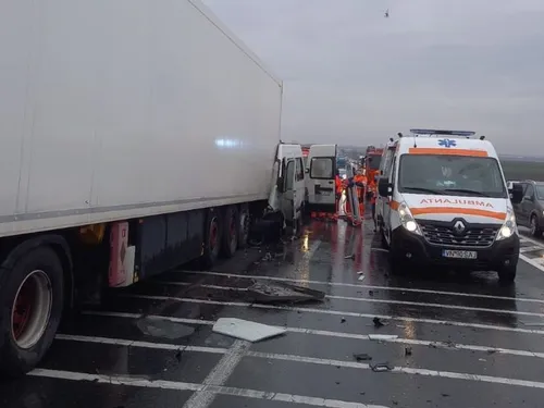 Autoutilitara, înmatriculată în Galaţi, a lovit TIR-ul, cu numere de Ucraina, care staţiona, cu triunghi reflectorizant. În urma impactului, autoutilitara a intrat sub camion.