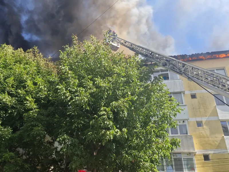 Acoperișul unui bloc ce patru etaje a luat foc în Piatra Neamț. Pompierii caută oamenii blocați