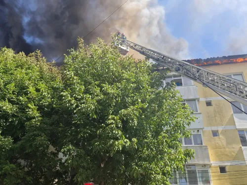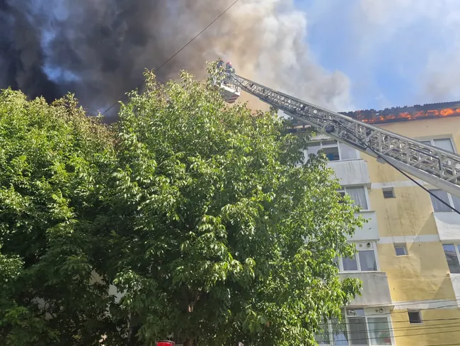 Incendiu puternic în Piatra Neamț. ISU Neamț anunță că "incendiul se manifestă la acoperișul unui bloc de locuințe cu nivel de înălțime parter + 4 etaje".