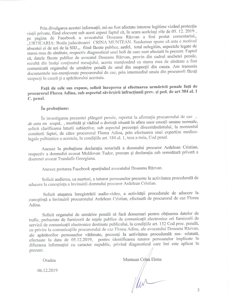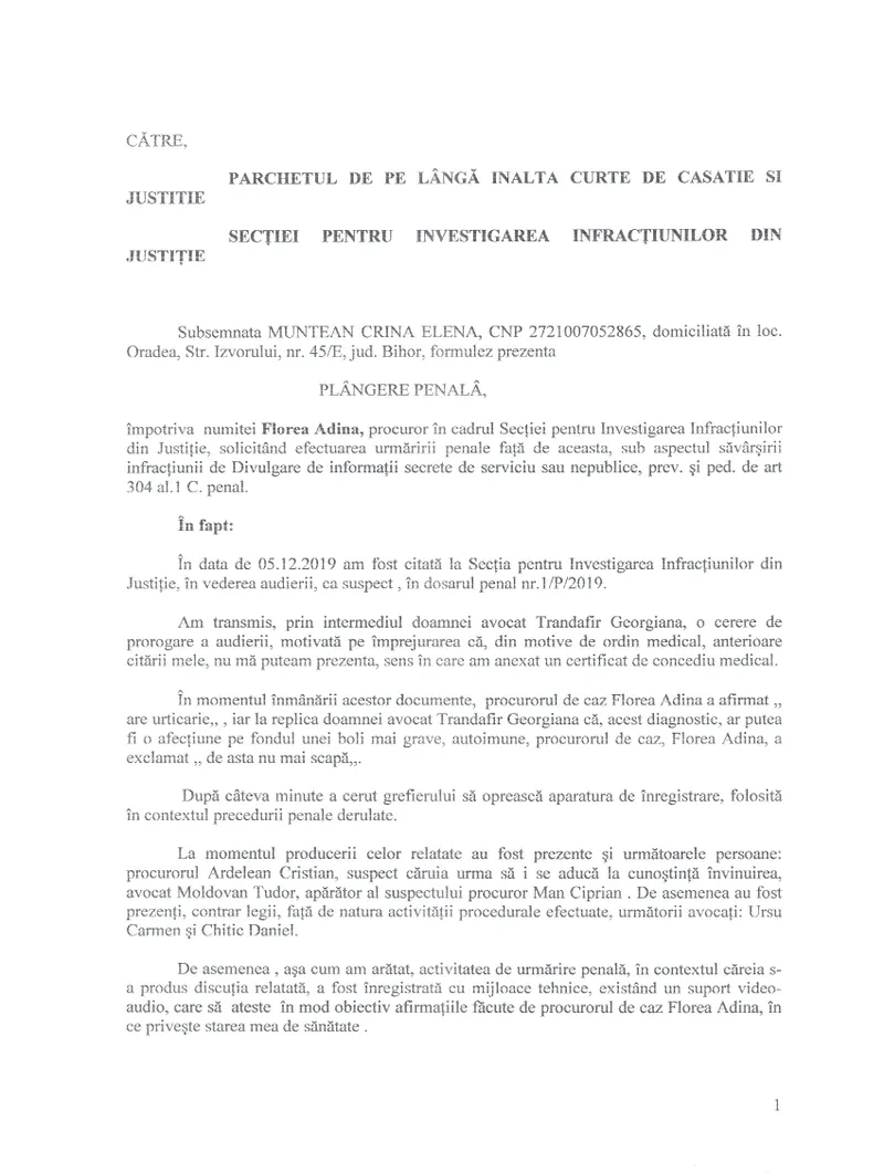 Judecătorea Crina Muntean a făcut, marți, plângere penală pe numele Adinei Florea, acuzând-o de divulgare de informații de serviciu secrete sau nepublice. Publicăm, mai jos, integral, plângerea penală făcută de Crina Muntean pe numele Adinei Florea.