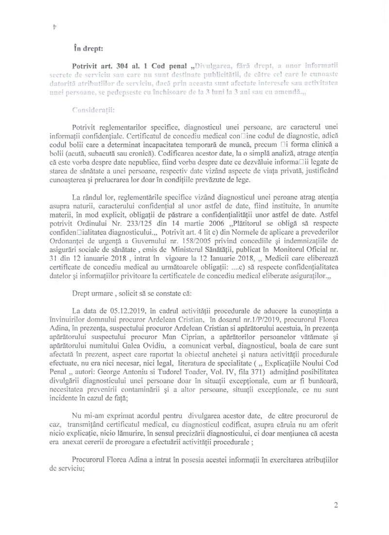 Petenta arata ca a transmis, prin intermediul domnului procuror Ardelean Cristian si a aparatorului acestuia, doamna avocat Trandafir Georgiana, o cerere prin care a solicitat prorogarea audierii, pentru motive medicale, anterioare citirii acesteia. De asemenea, aceasta arata ca motivele pentru care nu s-a putut prezenta au fost anterioare citarii sale, iar cererii sale i-a atasat un certificat de concediu medical.