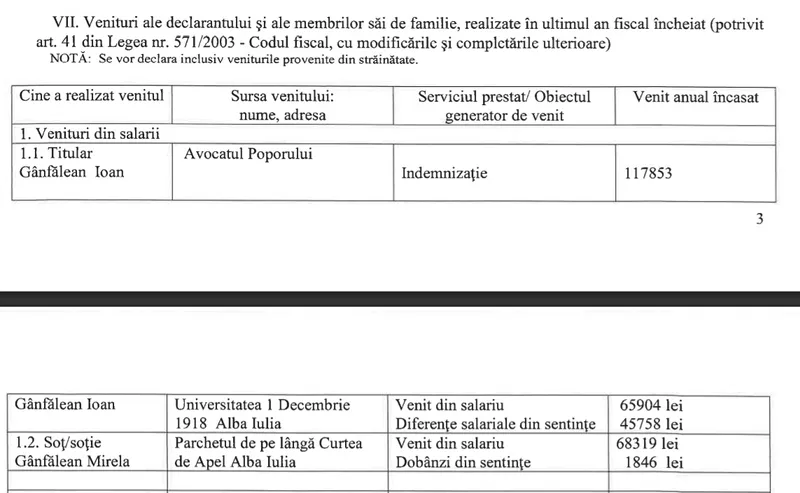 Ioan Gânfălean nu declară nici un cont în bancă. Anul trecut, el a încasat 117.853 de lei de la Avocatul Poporului, adică peste 9.800 de lei/lună, iar de la Universitatea „1 Decembrie 1918” Alba Iulia, încă 11.662 de lei. Soția sa, Mirela Gânfălean, este grefieră la Parchetul de pe lângă Curtea de Apel Alba Iulia.