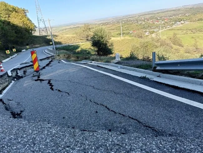 Între timp, alunecarea s-a produs și amploarea ei a depășit așteptările. Directorul Direcției Județene de Administrare a Drumurilor și Podurilor ne-a spus că situația este incomparabil mai complicată decât alunecarea care a afectat DJ 281D lângă Lacul Bulbucani, între Gropnița și Focuri.
