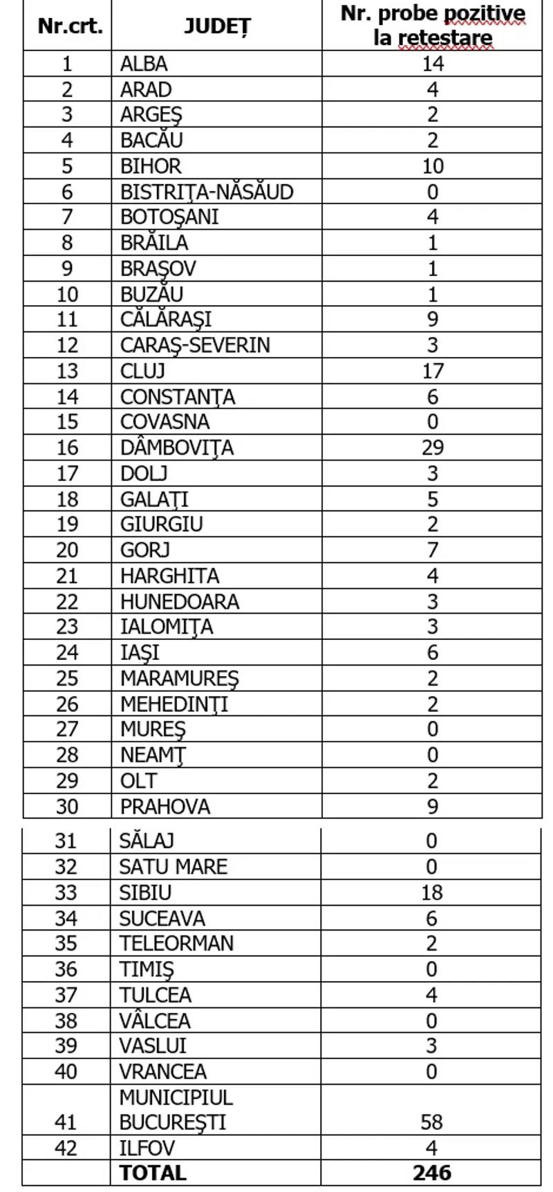 Distinct de cazurile nou confirmate, în urma retestării pacienților care erau deja pozitivi, 246 de persoane au fost reconfirmate pozitiv.