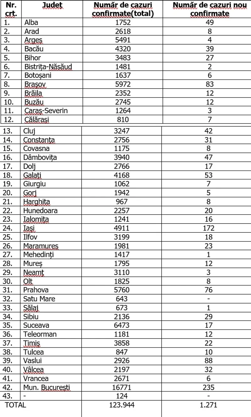În total, în România au fost confirmate, până în prezent, 123.944 de cazuri de infectare cu coronavirus, iar 4.748 de pacienți au murit.