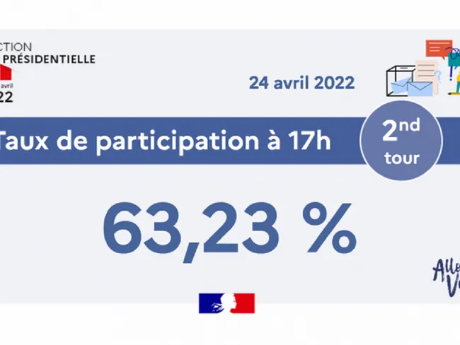 Prezența la vot la ora 17:00, ora Parisului a fost de 63%, a declarat Ministerul de Interne. În 2017, prezența la vot la ora 17:00 la primul tur al alegerilor prezidențiale din Franța continentală a fost de 69,42%. În 2012, această rată era de 70,59%, a informat Ministerul de Interne.
