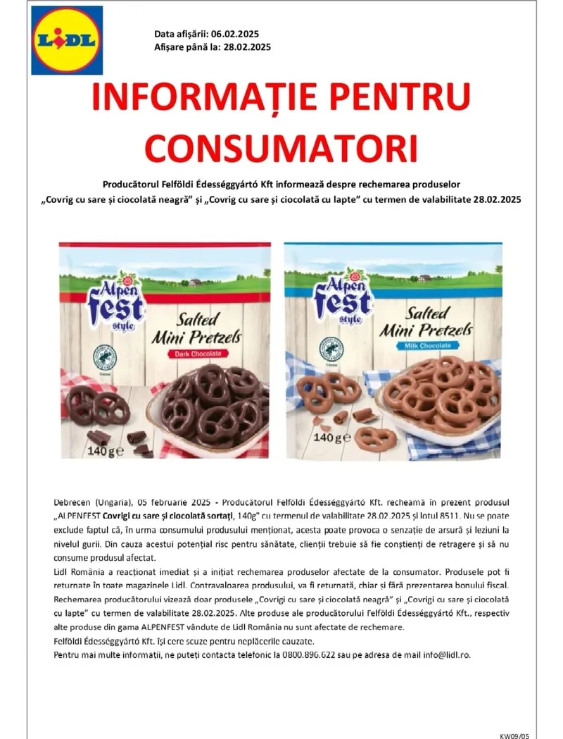 Mai exact, producătorul Felföldi Édességgyártó Kft. recheamă două sortimente de covrigi - „Covrigi cu sare și ciocolată neagră” și „Covrigi cu sare și ciocolată cu lapte”, produse comercializate în magazinele Lidl.
